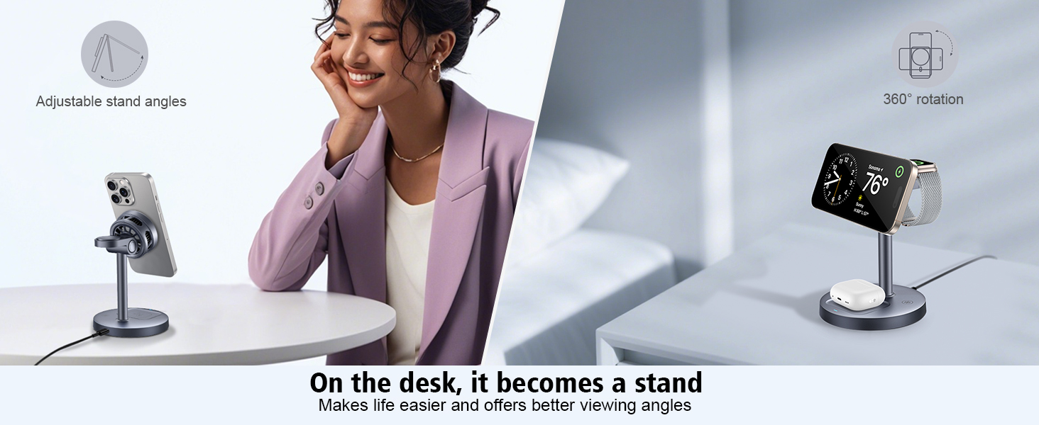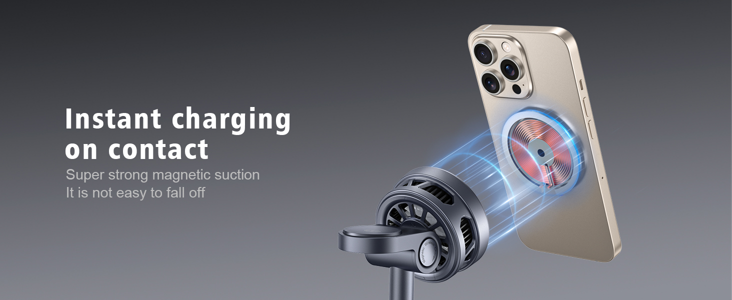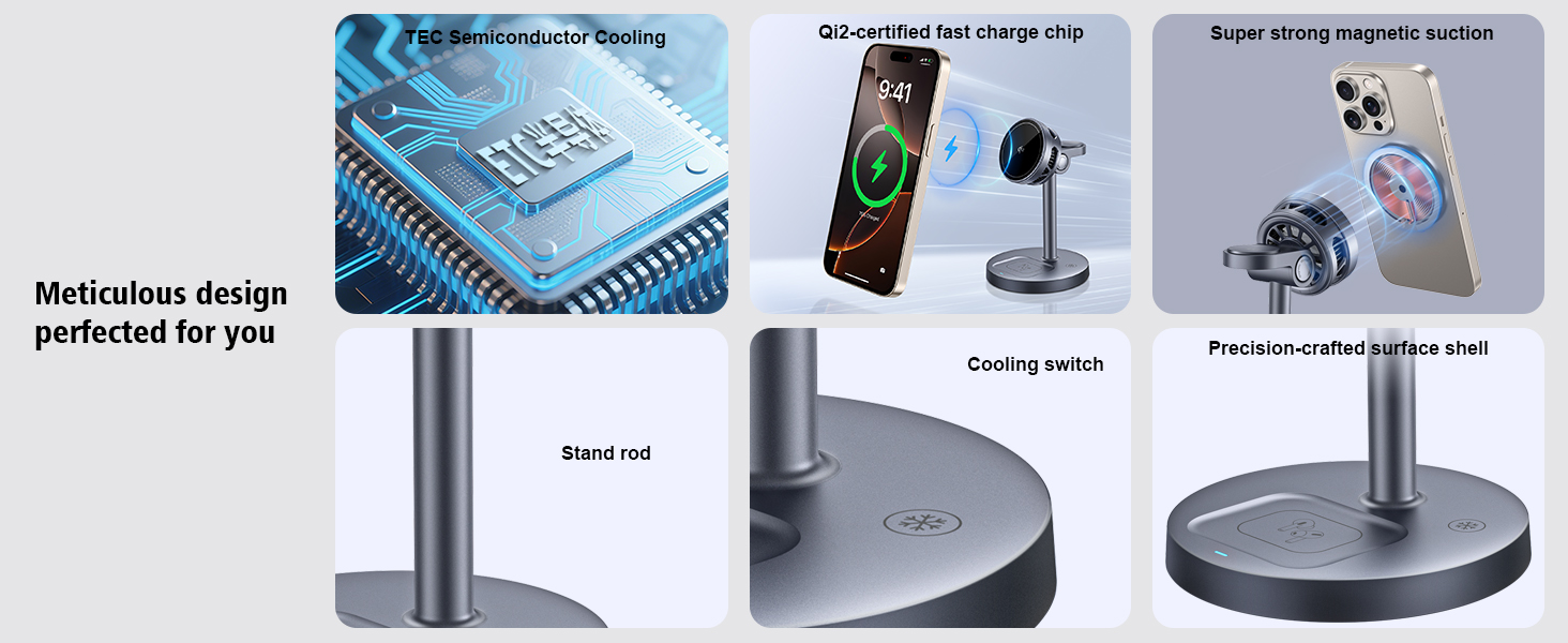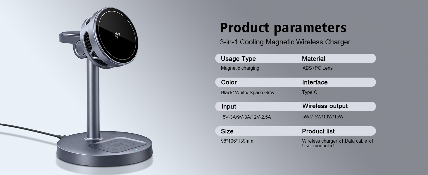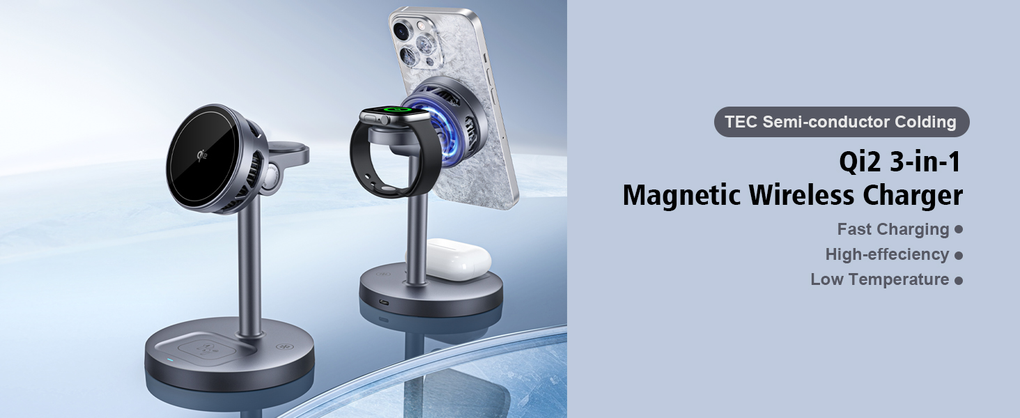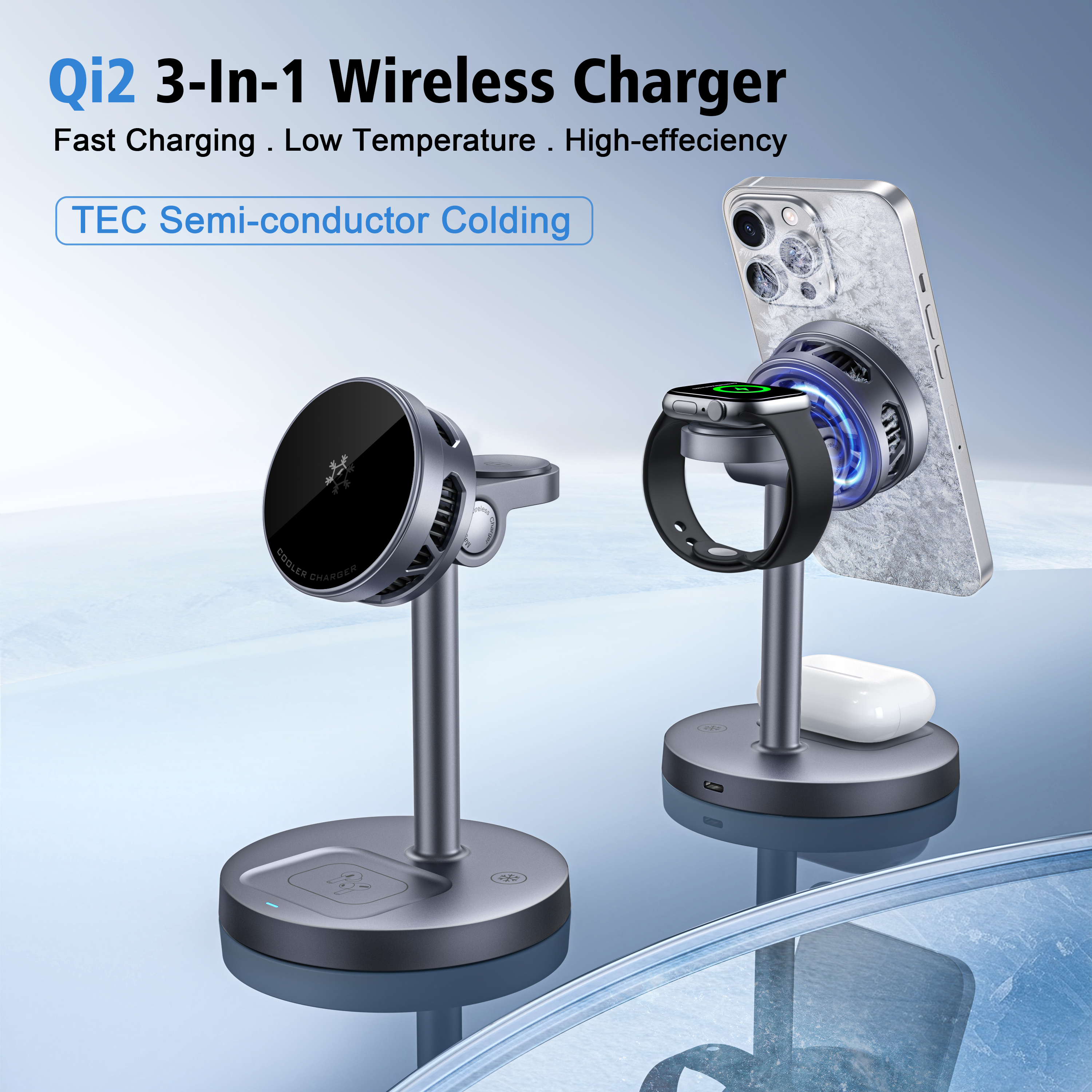 | qi2.2 25W Chip Solution: INJOINIC One - Core Triple - Charge Input Specifications: 5V/3A, 9V2A, 12V/2.5A,15V/3A Wireless output: 5W/7.5W/10W/15W/25W Max Mobile Phone Output: Phone qi2 MPP 25W Output for Watches: 2.5W Output for Headphones: 5W Magnetic (MagSafe)wireless charging Materials: ABS, Glass panel Processes: Metallic paint Accessories: C to C 20V 3A cable Colors: Titanium Gray Product Certifications: CE, ROHS, FCC ,QI2.2 Compatible with USB-C PD Chargers (45W-65W Required) | Qi2.2 certified – Unleashing Next-Gen Power qi2.2 25W 3-in-1 Magnetic (MagSafe)wireless charging Supports wireless charging for iPhone Magnetic (MagSafe series), iWatch, and AirPods wireless charging case iPhone17-16 series qi2.2 25w wireless fast charging,iPhone Air,20w Max iPhone15-12 series qi2 15w wireless fast charging Qi2 25W wireless fast charging; dual cooling: TEC refrigeration + high-speed fan Fast Charging ,High-effeciency ,Low Temperature TEC Semi-conductor Colding , Cooling wireless charger-16°C Built-in cooling fan with silent operation,Extra-large heat sink ,Continuous rapid heat dissipation Wireless fast charging with phone kept icy-cold Eliminates battery heat degradation from wireless charging Solves inefficient slow charging due to overheating Magnetic Phone,Desktop video & movie support stand 90-120° Adjustable stand angles ,360°rotation Super strong magnetic suction ,It is not easy to fall off | qi2.2 version MPP 25W |