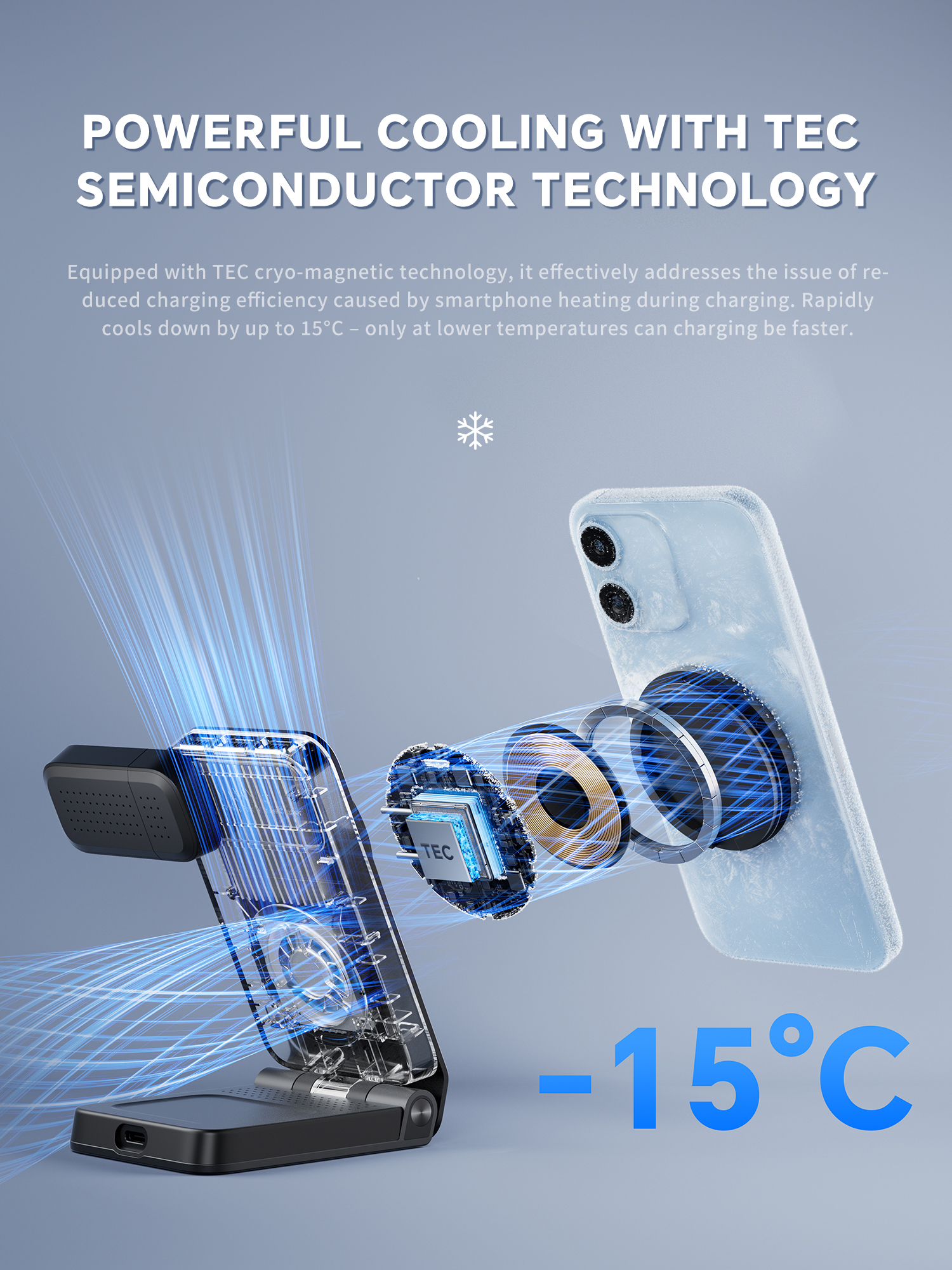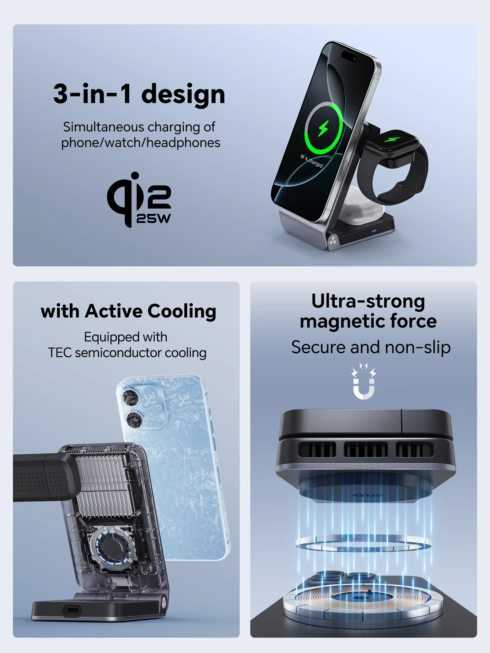 15915401682 qi2.2 25W Chip Solution: Main Control Yichong Chip, Watch Gravity Sensing Input Specifications: 15V/3A,20V/2.25A-3.25A Wireless output: 5W/7.5W/10W/15W/25W Max Mobile Phone Output: Phone qi2 MPP 25W Output for Watches: 2.5W Output for Headphones: 5W Magnetic (MagSafe)wireless charging Processes: High quality Metallic paint Accessories: C to C 20V 3A cable Compatible with USB-C PD Chargers (45W-65W Required) | Qi2.2 certified – Unleashing Next-Gen Power Industry-First Qi2.2 25W TEC Semiconductor Dual Cooling System + Foldable Storage 3-in-1 Magnetic (MagSfe)wireless charging Supports wireless charging for iPhone Magnetic (MagSfe series), iWatch, and ArPods wireless charging case Phone17-16 series qi2.2 25w wireless fast charging,Phone Air,20w Max Phone15-12 series qi2 15w wireless fast charging Wireless fast charging with phone kept icy-cold Eliminates battery heat degradation from wireless charging Solves inefficient slow charging due to overheating Liquid Silicone Magnetic Panel, Skin-Friendly, Scratch-Free for Phone Back Magnetic Phone,Desktop video & movie support stand 90-120° Adjustable stand angles ,360°rotation N52 Gs Super strong magnetic suction ,It is not easy to fall off | Materials: Aluminum alloy casing, Acrylic board Product Size:126.9*67*28.8mm Net Weight::260g Colors: Titanium Gray,White, Black Product Certifications: CE, ROHS, FCC QI2.2 |