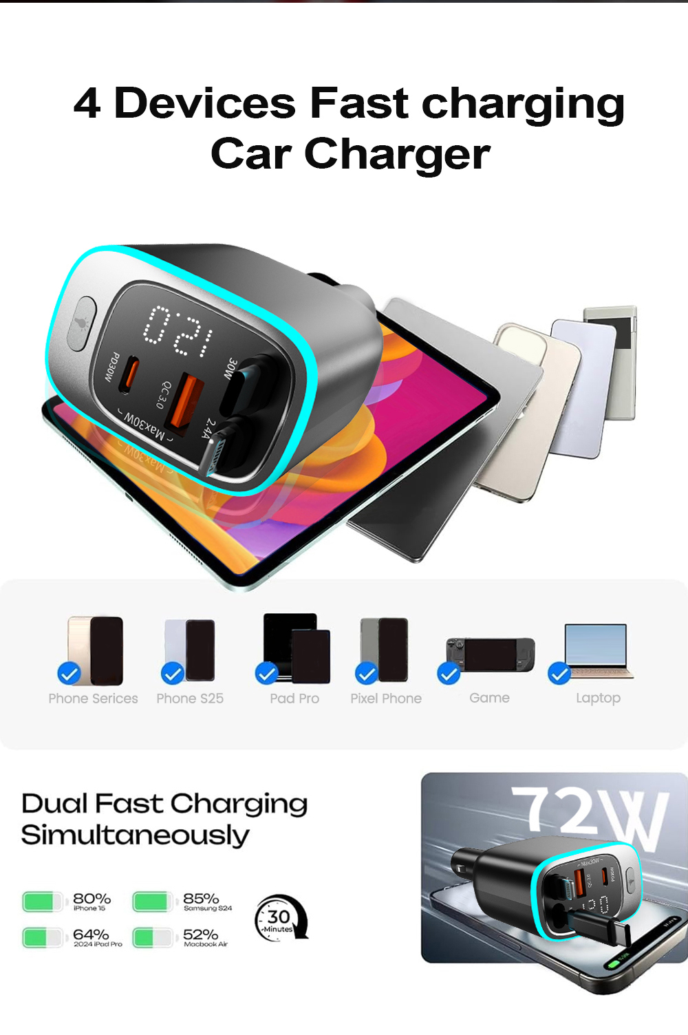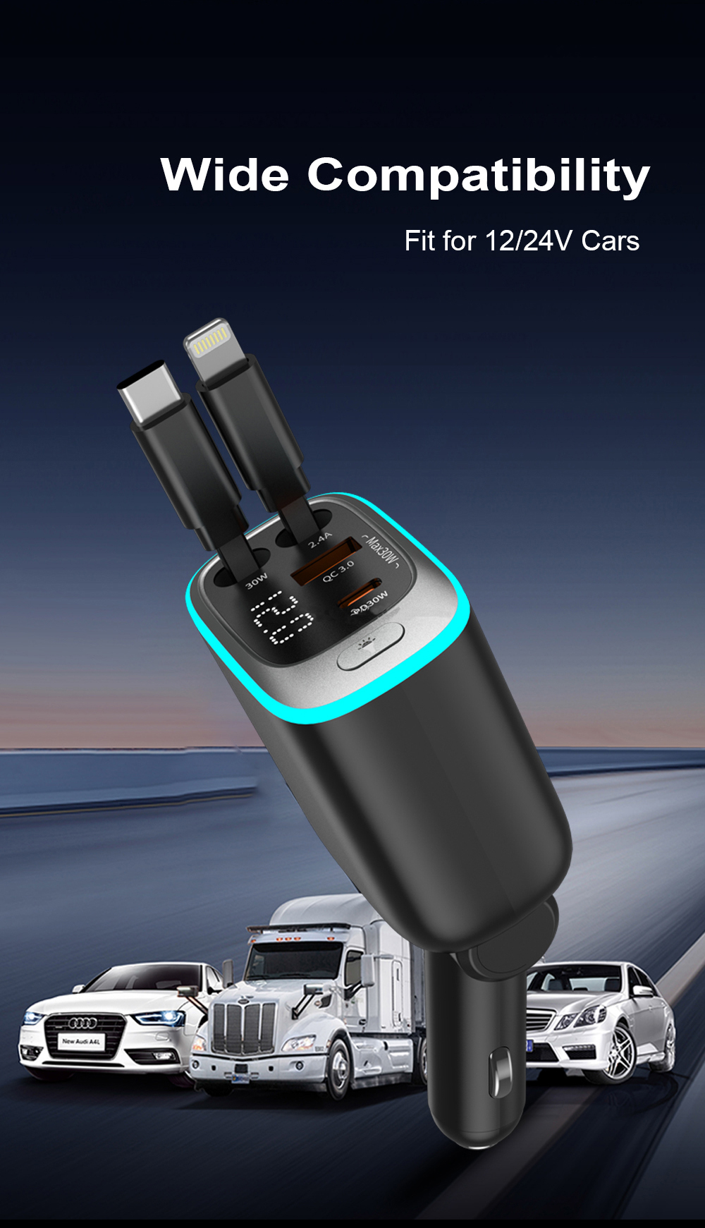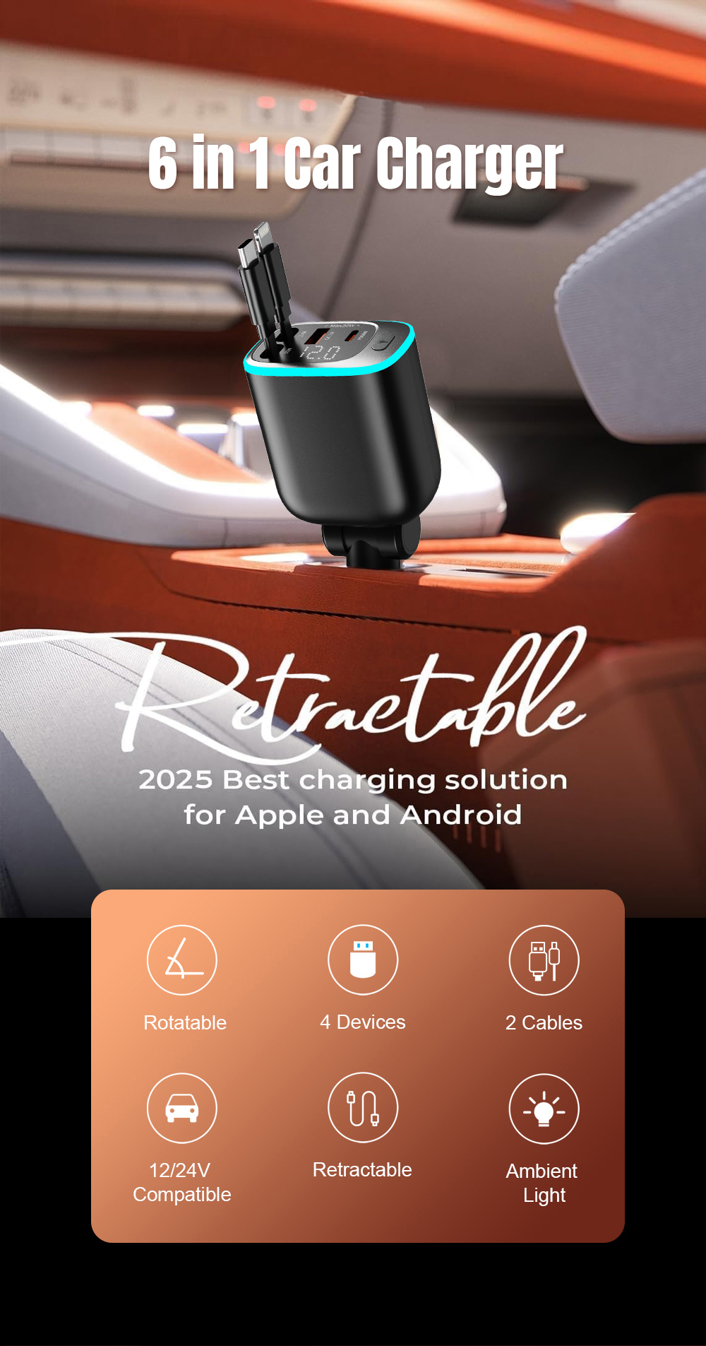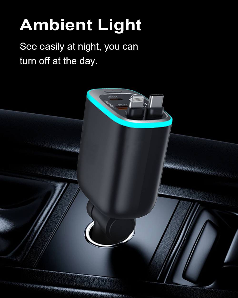 15915401682 90W 6 in 1 Multi-port car fast charger PD3.0 USB-C+QC3.0 USB-A Fast Charging Dual-Retractable PD3.0 USB-C Cable Fast Charging Input: DC 12V -24V Output Total Power: 90W Max Max Single Port Power USB-C: 5V/3A, 9V/3A, 12V/2.5A 30W Max PPS: 3.3-5.9V/3A ,PPS: 3.3-11V/2.75A USB-A1: 5V/3A, 9V/2A, 12V/1.5A 18W Max Type-C1 Cable: 5V/3A, 9V/3A, 12V/2.5A, 15V/2A, 20V/1.5A 30W Max Type-C2 Cable: 5V/3A, 9V/3A, 12V/2.5A, 15V/2A, 20V/1.5A 30W Max Dual-Port Fast Charge Power USB-C+C1+C2: 30W+30W+30W 90W Max USB-C+C1+C2+A1: 30W+30W+30W 90W Max Fast Charging Protocols USB PD3.0 30W, PPS, QC4+ QC3.0/2.0, FCP, SCP, AFC, Apple 2.4A, DCP | THE PERFECTCOMBINATION OF CAR CHARGER ANDRETRACTABLE CABLE No more messy wires cluttering your car. With this all-in-one design, the retractable cable tucks neatly away when not in use —so your vehicle's interior stays clean, organized, and always ready for the ride. Charge on the go without the hassle of tangled cords. This is how convenience meets order. 4-in-1 USB Car Fast Charger 4-Port Fast Charging:2 USB-Port & 2 Retractable USB-C Cables (65cm) Total Power: 90WHigh-power advantage: Equipped with the latest premium power solution configuration – unrivaled in performance. 3 Ports deliver max fast-charging power independently simultaneously – even when all 4 ports are in use. It enables three devices to charge at maximum power and one electronic digital device to charge, with no waiting. Charge 4 different devices at the same time – ideal for family trips, vacations, as well as professional drivers and delivery van drivers for daily use. Retractable USB-C Cable: PD 30W Retractable USB-C Cable: PD 30W USB-C Port: Multi-protocol 30W USB-A Port: Multi-protocol 18W Intelligent Fast Car Charger Fast, smart, secure – Reliable on-the-go charging. Real-time Voltage Monitoring – Built-in display shows vehicle voltage instantly, keeping you updated. Smart Protection – High-performance chip guards against overcurrent, overvoltage, and overtemperature. Charge safely. 180° Adjustable Car Charger Its 180° rotation fits tight spaces—near dashboard or gear stick—so plugging in is easy, no fumbling. Works front or back seat. Rotate to where you’re sitting; no more yanking cords. Keeps cables safe and neat, too—no crushing, bending, or tangling. Flame-Retardant ABS: Safety You Can Rely On Crafted from high-quality flame-retardant ABS plastic, this car charger is built to defuse safety risks: Flame resistance: The material resists ignition even in high-temperature environments (like prolonged use or near vehicle heat sources), reducing fire hazards. Stable insulation: It effectively insulates electrical components, preventing short circuits or leakage that could damage devices or the car’s circuit system. Charge with confidence—whether on a long drive or daily commute, it keeps your vehicle and devices safe, mile after mile. 2026' s Premier Car Charging Solution for Apple and Android Our car charger will be the 2026 - selling and most influential charging option on Amazon for all car owners. It's the go - to pick for both Aple and Android users, receiving rave reviews from a vast number of satisfied customers. Join the countless users who have already made this their top - choice car charger and experience the difference it can make in your charging convenience. Built to Last: Ultra-Durable Retractable Cables Tested to 10,000+ retractions, 10,000+ bends, and 10,000+ USB-C plug-unplug cycles—under lab conditions. No flimsy wear or frequent breaks. It stays tough, even with daily plugging, folding, and retracting—reliable for the long haul. Constant Max Power It delivers full power at all times—no false claims, no sudden drops. Even during extended use, charging speed stays consistent, with zero power compromise. Craftsmanship & Quality Craft = A Premium Bestseller,Born to be different, with extraordinary character. Car Charger Panel Featuring an independent dual-panel design—one with a metallic texture, the other with a high-gloss black finish. Every design detail is thoughtfully crafted to match the user's pursuit of value. Full-Round Ambient Light Ring Designed with a specific ice-blue dimming effect—unlike harsh, eye-straining blue light. It comes with an independent button for on/off control: a sophisticated lighting design that enhances ambiance, protects eyes, and offers convenient control. |