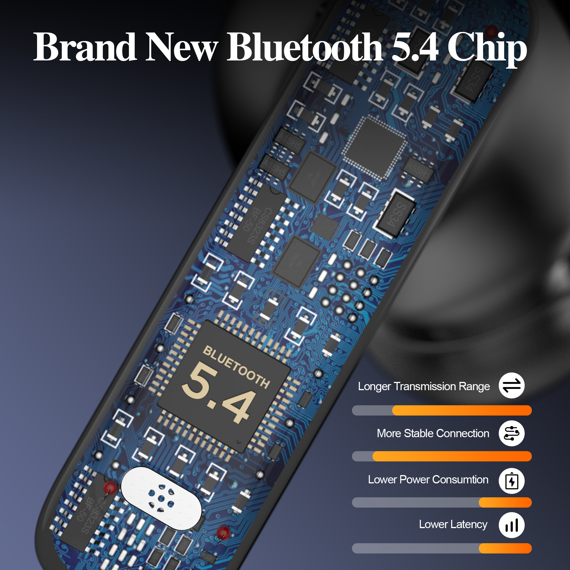 Bluetooth Chip: AB5656C V5.4Battery Capacity: Earbuds - 28 mAh, Charging Case - 180 mAhPlaytime: 4-5