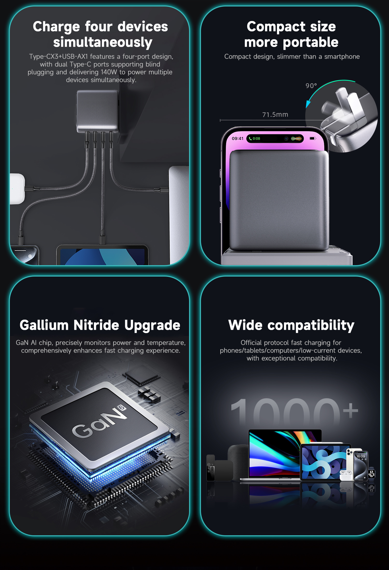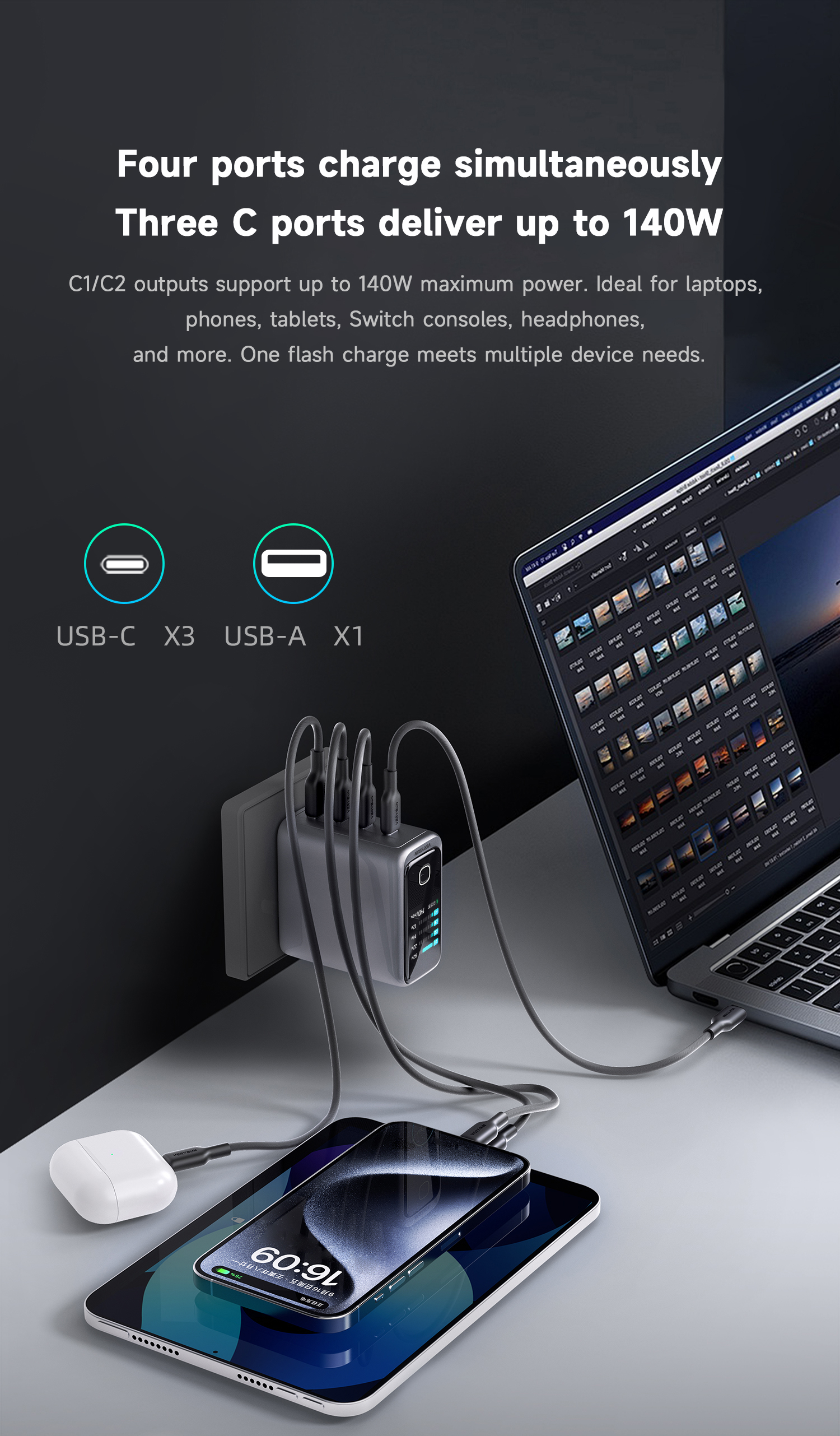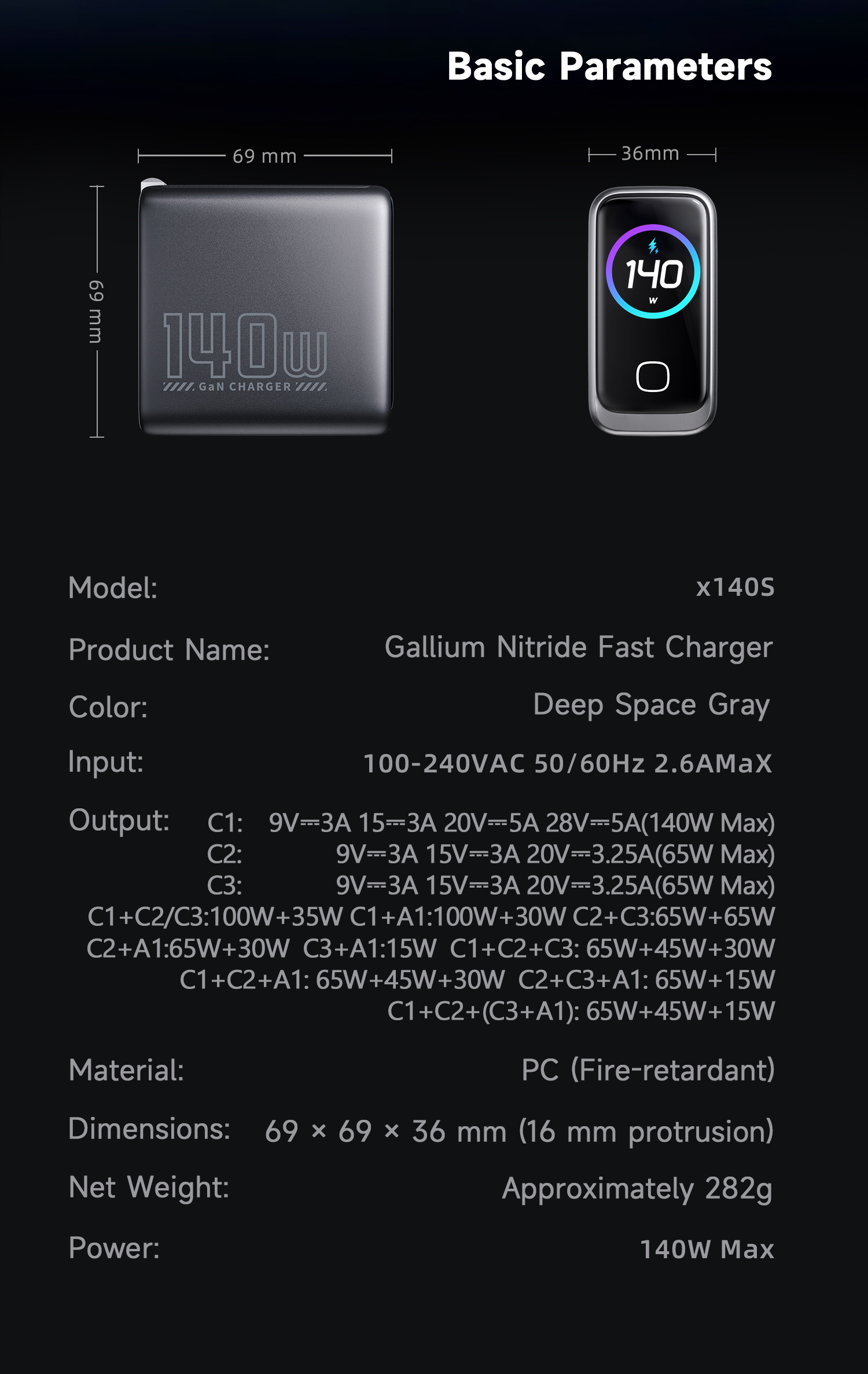 15915401682 GaN 140W Ultra PowerView AI 2.0 GaN Fast Charger PD3.1 USB-C1+C2+C3+A1 Input: AC 100-240V 50/60Hz 2.6A Max Output Total Power: 140W Max USB-C1: 5V/3A, 9V/3A,12/3A,15V/3A, 20V/5A, 28V/5A 140W Max PD3.1 EPR Capable 28V/5A 140W AVS: 15V-28V 140W PPS: 5-21V/5A 100W USB-C2: 5V/3A, 9V/3A,12/3A,15V/3A, 20V/3.25A 65W Max PD3.0 PPS: 3.3-21V/3A, QC5 USB-C3: 5V/3A, 9V/3A,12/3A,15V/3A, 20V/3.25A 65W Max PD3.0 PPS: 3.3-21V/3A USB-A: 5V/3A, 9V/2A, 12V/2.5A, 20V/1.5A 30W Max POWER Charging Protocols Support USB PD3.1 EPR 140W, PPS, AVS, QC5 TFCP: 4.0-21V / 0.3-6.5A 136.5W QC3.0&2.0: 5-20V / 3.25A 65W SCP: 3.3V-12V / 0.3-4.0A 40W UFCS: 5-11V / 4.0A 44W FCP: 5-12V / 2.0A 36W AFC: 5-12V / 2.0A 24W Apple 2.4A 12W, DCP SAM 2A 10W | 1-Port Charging 140W Max USB-C1: 28V/5A 140W USB-C2: 20V/3.25A 65W USB-C3: 20V/3.25A 65W USB-A1: 20V/1.50A 30W 2-Port Charging 135W Max USB-C1+C2: 20V5A+20V/1.75A 100W+35W USB-C1+C3: 20V5A+20V/1.75A 100W+35W USB-C1+A1: 20V5A+20V/1.50A 100W+30W USB-C2+C3: 20V3.25A+20V/3.25A 65W+65W USB-C2+A1: 20V3.25A+20V/1.50A 65W+30W USB-C3+A1: 5V3.0A 15W 3-Port Charging 140W Max USB-C1+C2+C3: 20V3.25A+20V/2.25A+20V1.50A 65W+45W+30W USB-C1+C2+A1: 20V3.25A+20V/2.25A+20V1.50A 65W+45W+30W USB-C1+C3+A1: 20V5A+5V3.0A 100W+15W USB-C2+C3+A1: 20V3.25A+5V3.0A 65W+15W 4-Port Charging 125W Max USB-C1+C2+C3+A1: 20V3.25A+20V/2.25A+20V1.50A 65W+45W+15W PS:A standard-rated charging cable is needed to enable high-power fast charging. PD3.0 100W: C-C 100W 5A E-marker fast charging cable required PD3.1 140W: C-C 240W 5A E-marker fast charging cable required | AC Plug (X): US Collapsible plug Size: 68.8(L)x35.9(W)x69.3(H) mm 94 V0 fire-proof PC housing Technology:Metallic Paint Color: Titanium Gris-oscuro Product Standard:CE / ROHS / FCC CB / UL / ETL , UKCA , PSE / KC |