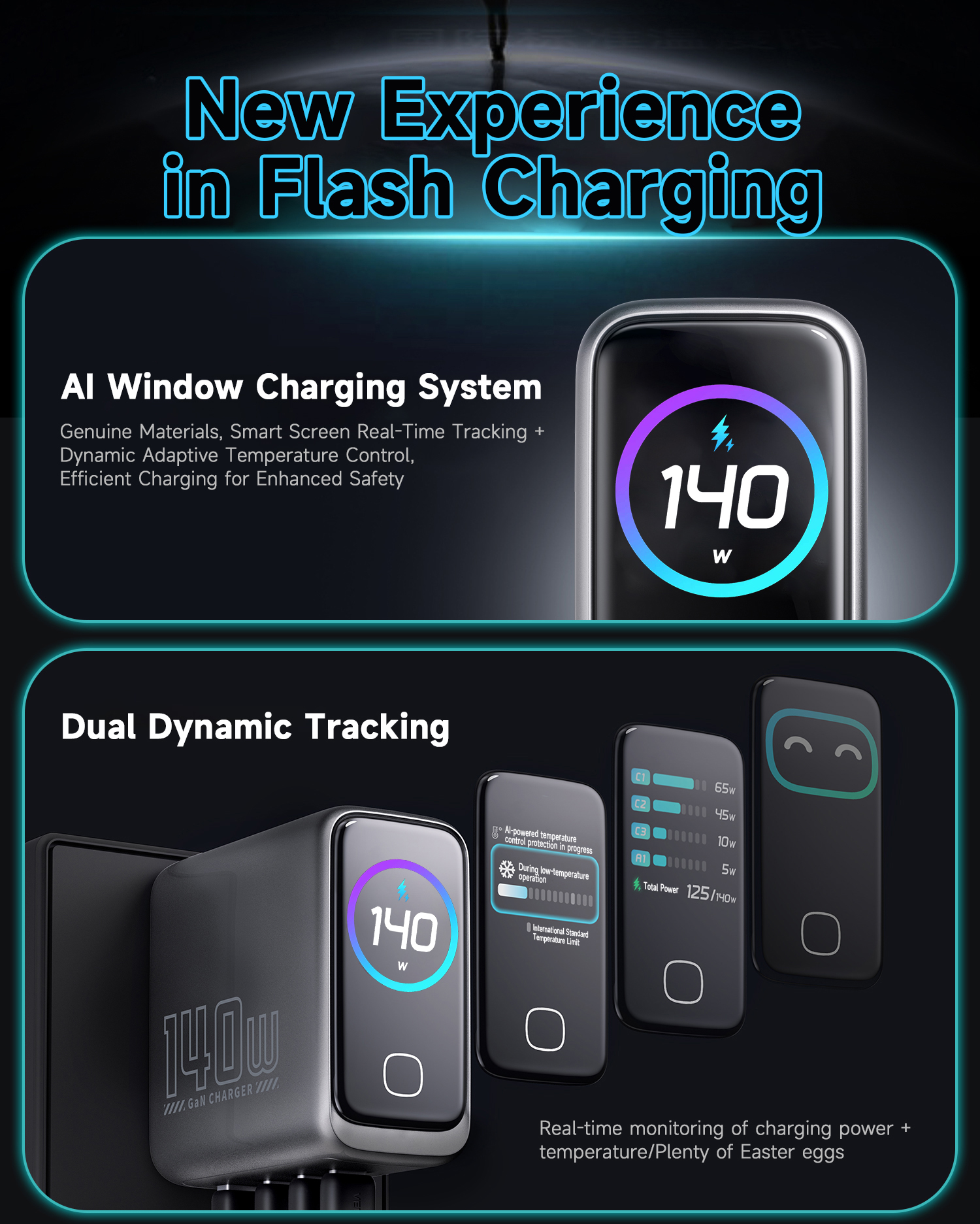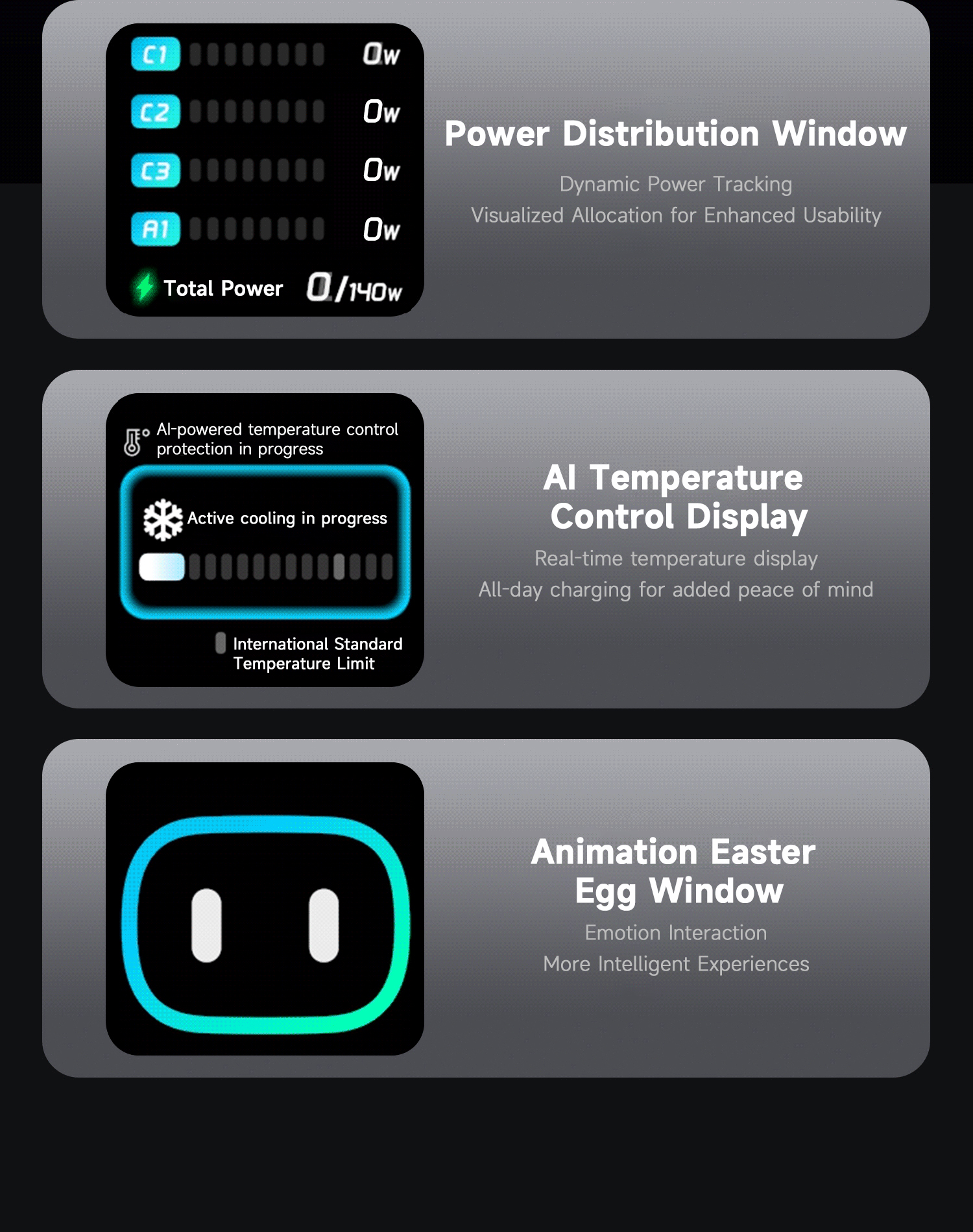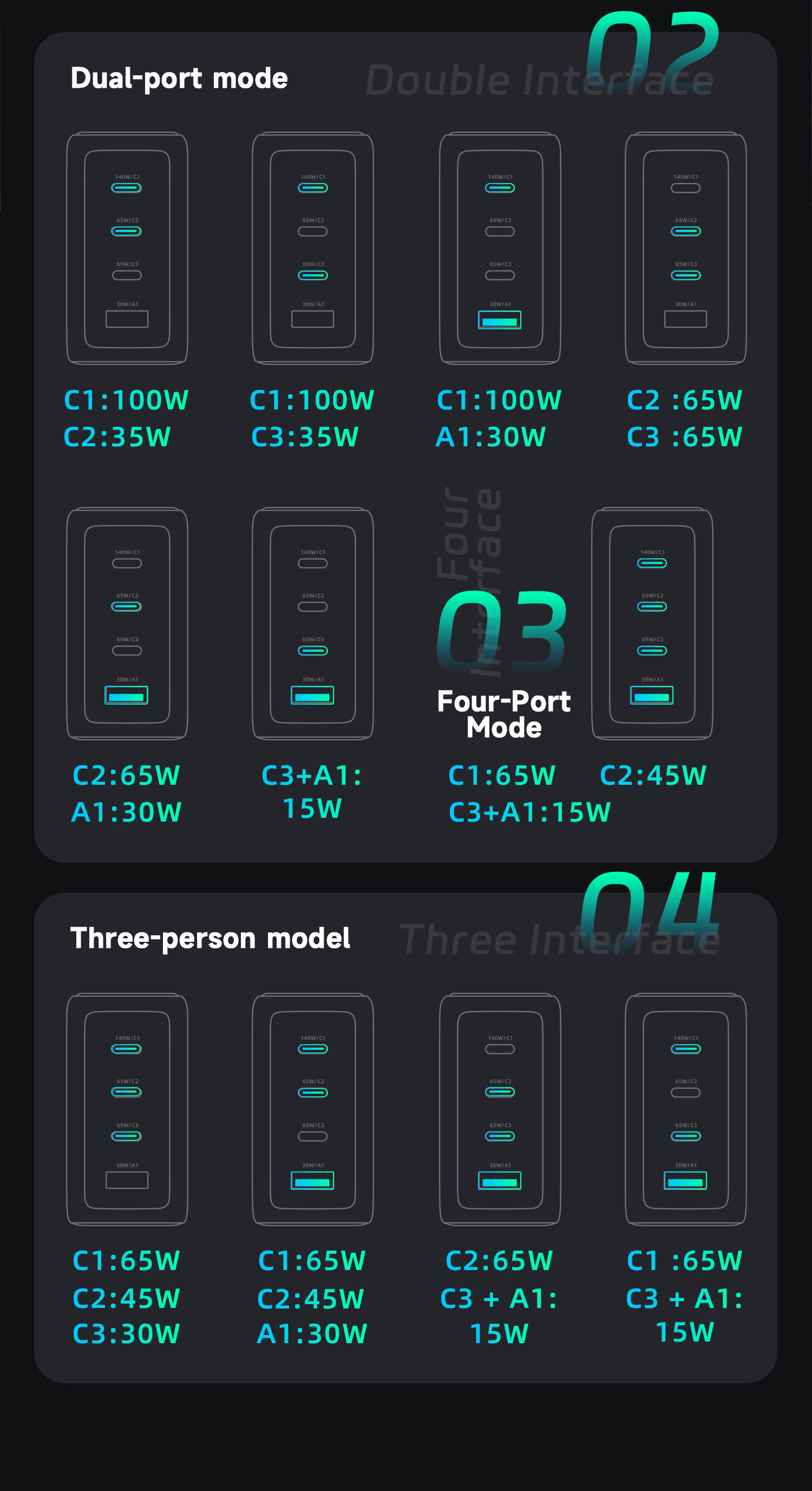 15915401682 GaN 140W Ultra PowerView AI 2.0 GaN Fast Charger PD3.1 USB-C1+C2+C3+A1 Input: AC 100-240V 50/60Hz 2.6A Max Output Total Power: 140W Max USB-C1: 5V/3A, 9V/3A,12/3A,15V/3A, 20V/5A, 28V/5A 140W Max PD3.1 EPR Capable 28V/5A 140W AVS: 15V-28V 140W PPS: 5-21V/5A 100W USB-C2: 5V/3A, 9V/3A,12/3A,15V/3A, 20V/3.25A 65W Max PD3.0 PPS: 3.3-21V/3A, QC5 USB-C3: 5V/3A, 9V/3A,12/3A,15V/3A, 20V/3.25A 65W Max PD3.0 PPS: 3.3-21V/3A USB-A: 5V/3A, 9V/2A, 12V/2.5A, 20V/1.5A 30W Max POWER Charging Protocols Support USB PD3.1 EPR 140W, PPS, AVS, QC5 TFCP: 4.0-21V / 0.3-6.5A 136.5W QC3.0&2.0: 5-20V / 3.25A 65W SCP: 3.3V-12V / 0.3-4.0A 40W UFCS: 5-11V / 4.0A 44W FCP: 5-12V / 2.0A 36W AFC: 5-12V / 2.0A 24W Apple 2.4A 12W, DCP SAM 2A 10W | 1-Port Charging 140W Max USB-C1: 28V/5A 140W USB-C2: 20V/3.25A 65W USB-C3: 20V/3.25A 65W USB-A1: 20V/1.50A 30W 2-Port Charging 135W Max USB-C1+C2: 20V5A+20V/1.75A 100W+35W USB-C1+C3: 20V5A+20V/1.75A 100W+35W USB-C1+A1: 20V5A+20V/1.50A 100W+30W USB-C2+C3: 20V3.25A+20V/3.25A 65W+65W USB-C2+A1: 20V3.25A+20V/1.50A 65W+30W USB-C3+A1: 5V3.0A 15W 3-Port Charging 140W Max USB-C1+C2+C3: 20V3.25A+20V/2.25A+20V1.50A 65W+45W+30W USB-C1+C2+A1: 20V3.25A+20V/2.25A+20V1.50A 65W+45W+30W USB-C1+C3+A1: 20V5A+5V3.0A 100W+15W USB-C2+C3+A1: 20V3.25A+5V3.0A 65W+15W 4-Port Charging 125W Max USB-C1+C2+C3+A1: 20V3.25A+20V/2.25A+20V1.50A 65W+45W+15W PS:A standard-rated charging cable is needed to enable high-power fast charging. PD3.0 100W: C-C 100W 5A E-marker fast charging cable required PD3.1 140W: C-C 240W 5A E-marker fast charging cable required | AC Plug (X): US Collapsible plug Size: 68.8(L)x35.9(W)x69.3(H) mm 94 V0 fire-proof PC housing Technology:Metallic Paint Color: Titanium Gris-oscuro Product Standard:CE / ROHS / FCC CB / UL / ETL , UKCA , PSE / KC |