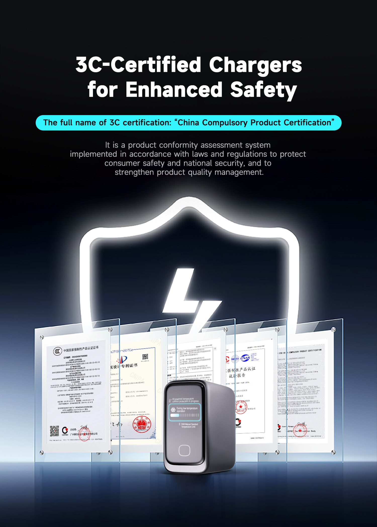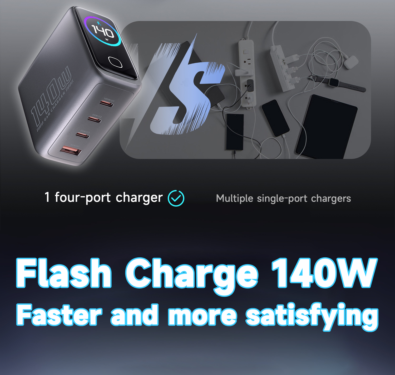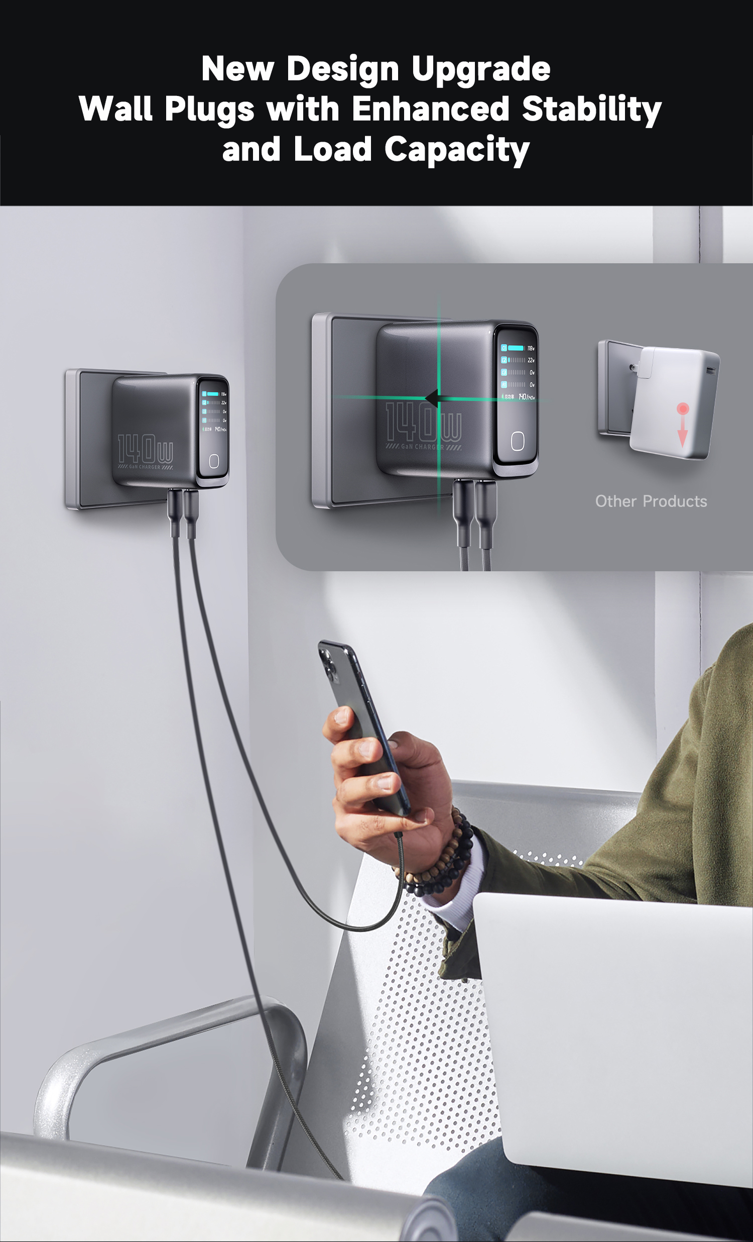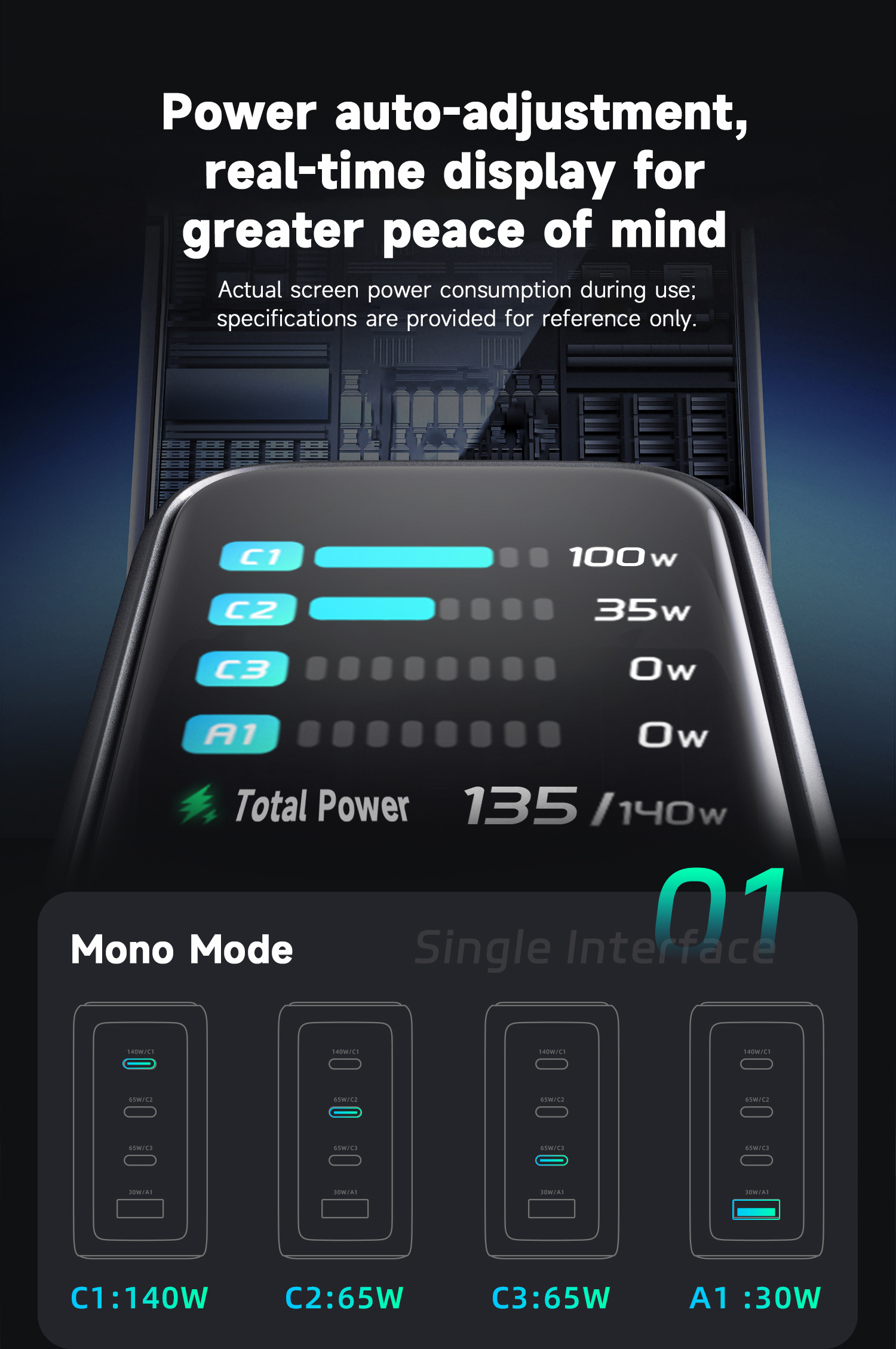 PowerView AI 2.0 —— 140W Ultra GaN Fast Charger 3C1A PD3.1 New generation of intelligent display chargers 140W Super Fast Charging,Smaller and More Powerful USB Out Power Display, Smart temp Control, HD display – Clear at a glance. 3C1A 4-Port USB GaN Charger, 140W Max PD3.1 USB-C1 Ultra Fast Charge 140W 3-USB Ports: 65W+45W+35W Fast Charging, Triple Ports forComprehensive Power Delivery 125W 4-Port Devices Simultaneous Charging, 65W+45W Fast Charging, 15W USB 3&4 Power 2 Devices Simultaneously 110W Dual High-Speed USB-C Ports: 65W+65W Dual Fast Charge, Rapid power charging for two laptops simultaneously. Latest AVS 100W Protocol :To charge protocol-compliant devices. faster, efficient, battery-safe Charging Clear HD Display: Charging Status, Temp & Port Details—At a Glance Track Total and Single Port Power in Real Time, Power Speed Dynamic updates, anytime anywhere. PowerView AI Real-Time Monitoring & Temperature/Power Regulation. Smart Display and control ,Smart Temp Monitoring for Secure Charging ,Safe Charging—Temperatures Well Below Limits. Real-Time Power andTemperature Monitoring The high-definition color display provides a detailed view of the charging status, temperature, and port details, keeping you fully informed. 100% Charging complete! Safety protection active Charging complete, trickleprotection activated, Avoid continuous charging after the battery is fully charged; maintain battery health and lifespan with trickle charging. Give you complete peace of mind 140W & 100W MacBook Pro 16 inch" ,100W & 70W MacBook Pro/Air 13 in"/ 14 in" / 15 in" PD3.1 140W-100W-65W-45W-35W-20W Power bank. 65W/45W/30W/20W Phone Series, iPad Pro/Air.....Various USB charging products | ||