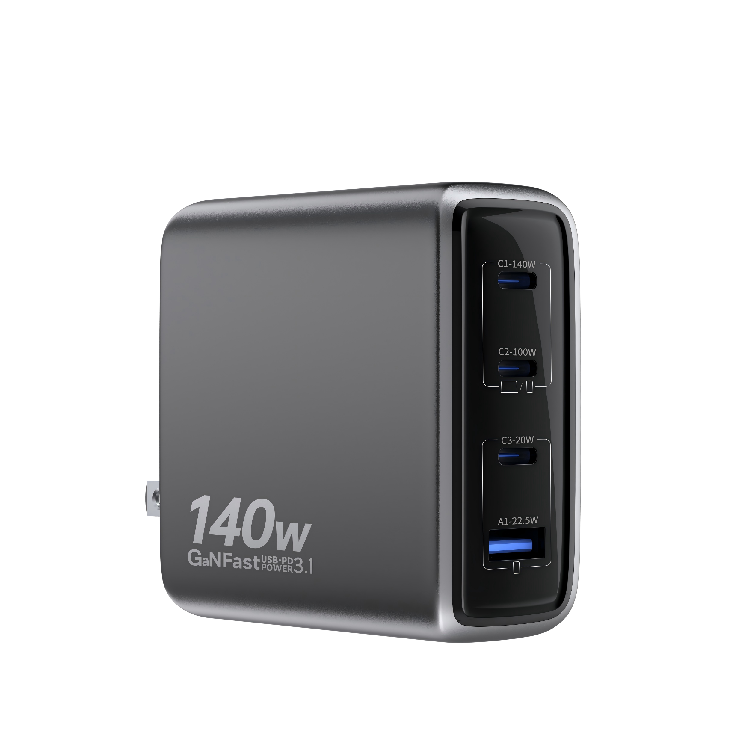 15915401682 GaN 140W Pro Max GaN Super Fast Charger PD3.1 USB-C1+C2+C3+A1 Input: AC 100-240V 50/60Hz 2.0A Max Output Total Power: 140W Max USB-C1: 5V/3A, 9V/3A,12/3A,15V/3A, 20V/5A, 28V/5A 140W Max PPS: 3.3-21V/5A 100W,EPR Capable 28V/5A 140W USB-C2: 5V/3A, 9V/3A,12/3A,15V/3A, 20V/5A 100W Max PD3.0 PPS: 3.3-21V/5A 100W USB-C3: 5V/3A, 9V/2.22A,12/1.67A 20W Max PPS: 3.3-5.9V/3A , 3.3-11/2A USB-A: 5V/3A, 9V/2A, 10V/2.25, 12V/2A 22.5Max POWER Charging Protocols Support USB PD3.1 EPR 140W, PPS, QC5 QC3+&2.0: 5-12V / 2.0A 24W SCP: 3.3V-12V / 0.3-5.0A 23W FCP: 5-12V / 2.0A 18W Apple 2.4A 12W, DCP 7.5W | 1-Port Charging 140W Max USB-C1: 28V/5A 140W USB-C2: 20V/5A 100W USB-C3: 12V/3.25A 20W USB-A1: 12V/1.50A 22.5W 2-Port Charging 130W Max USB-C1+C2: 20V5A+20V/1.75A 100W+30W USB-C1+C3: 20V5A+12V/1.67A 100W+20W USB-C1+A1: 20V5A+12V/1.50A 100W+22.5W USB-C2+C3: 20V5A+12V/1.67A 100W+20W USB-C2+A1: 20V5A+12V/1.50A 100W+22.5W USB-C3+A1: 5V3.0A 15W 3-Port Charging 115W Max USB-C1+C2+C3: 20V3.25A+20V/1.5A+12V1.67A 65W+30W+20W USB-C1+C2+C3: 20V/1.5A+20V3.25A+12V1.67A 30W+65W+20W USB-C1+C2+A1: 20V3.25A+20V/1.5A+12V1.50A 65W+30W+22.5W USB-C1+C2+A1: 20V/1.5A+20V3.25A+12V1.50A 30W+65W+22.5W USB-C1+C3+A1: 20V5A+5V3.0A 100W+15W USB-C2+C3+A1: 20V5A+5V3.0A 100W+15W 4-Port Charging 110W Max USB-C1+C2+C3+A1: 20V3.25A+20V/1.5A+5V3A 65W+30W+15W USB-C1+C2+C3+A1: 20V/1.5A+20V3.25A+5V3A 30W+65W+15W | AC Plug (X): US Collapsible plug Size: 73.9(L)x33(W)x73(H) mm 94 V0 fire-proof PC housing Technology:Metallic Paint & Black Gloss UV Color: Titanium Gray+Black Product Standard:CE / ROHS / FCC CB / UL / ETL , UKCA , PSE / KC |