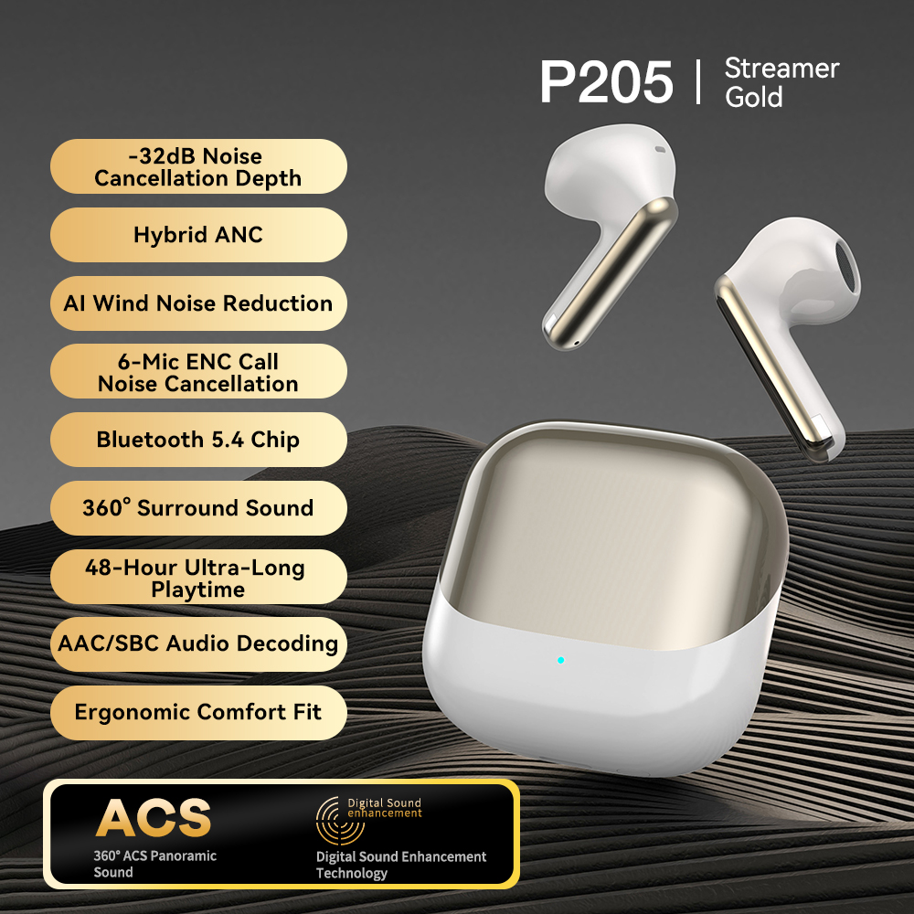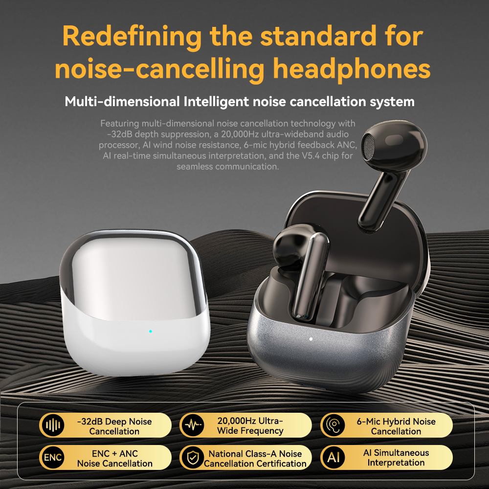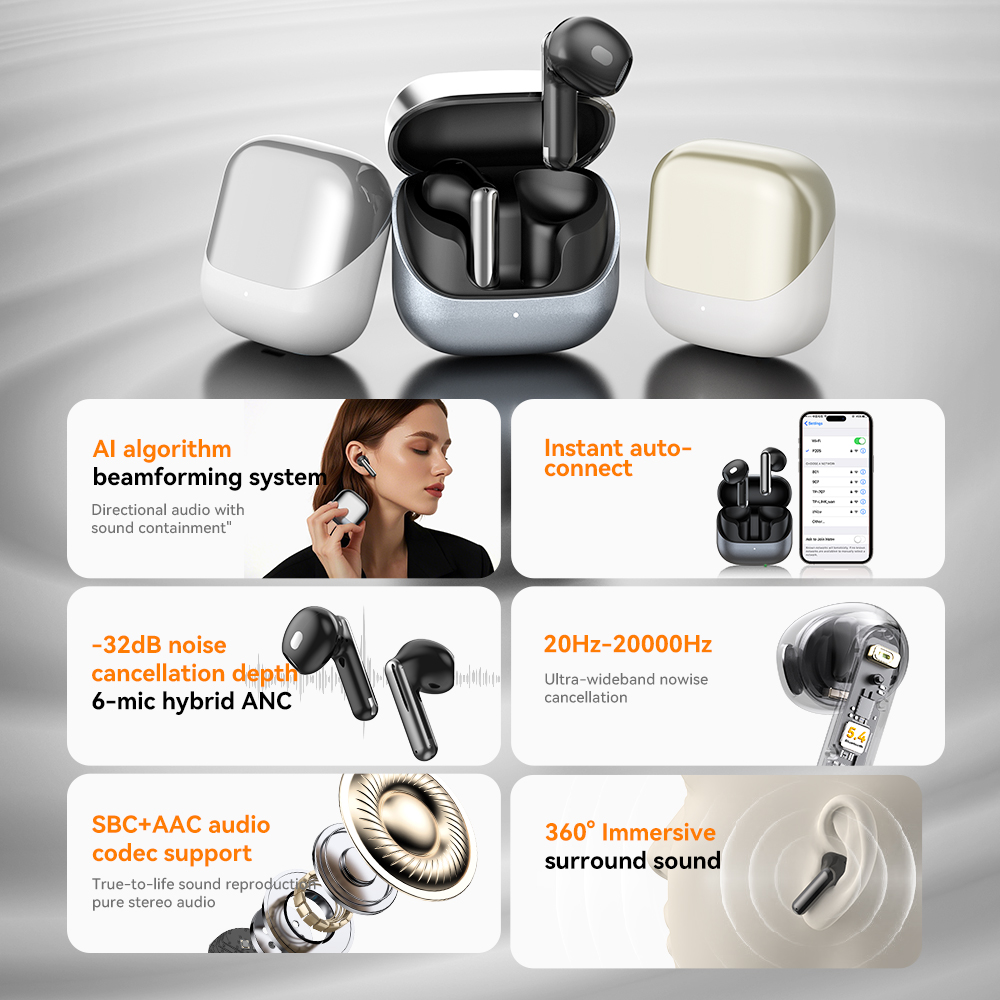 | Bluetooth Chip: JL7096D6, V5.4 Battery Capacity: Earbuds - 40 mAh, Charging Case - 400 mAh Playtime: 8-9 h (at 60% volume) ,Charging case endurance 32H Charging Time: Approximately 1.2h for earbuds and 2 h for the charging case Speaker Size: 13 mm Number of Microphones: 6 Silicon MIC (L+R) Other Functions: Call Noise Cancellation: 2 - MIC ENC Active Noise Cancellation: 2 - MIC ANC - FF + FB, hybrid dual - feed 28db max In - ear Detection: Optical Sensing Detection Waterproof Rating: IPX4 (LR) Charging Interface: Type C Hall Switch: Yes Processes: Electroplating, Painting, UV Coating; Colors: Dark gray, silver white, skin gold color | Product Certification:CE ROHS FCC |