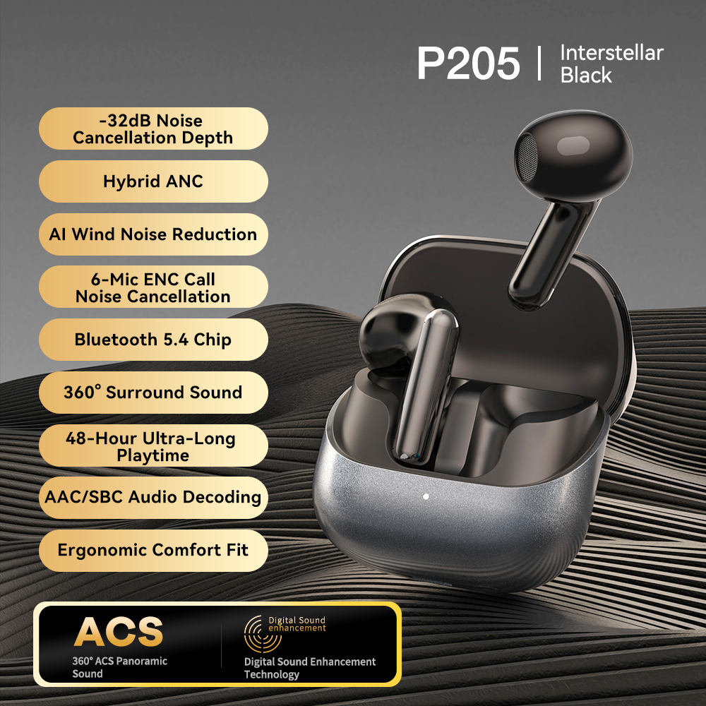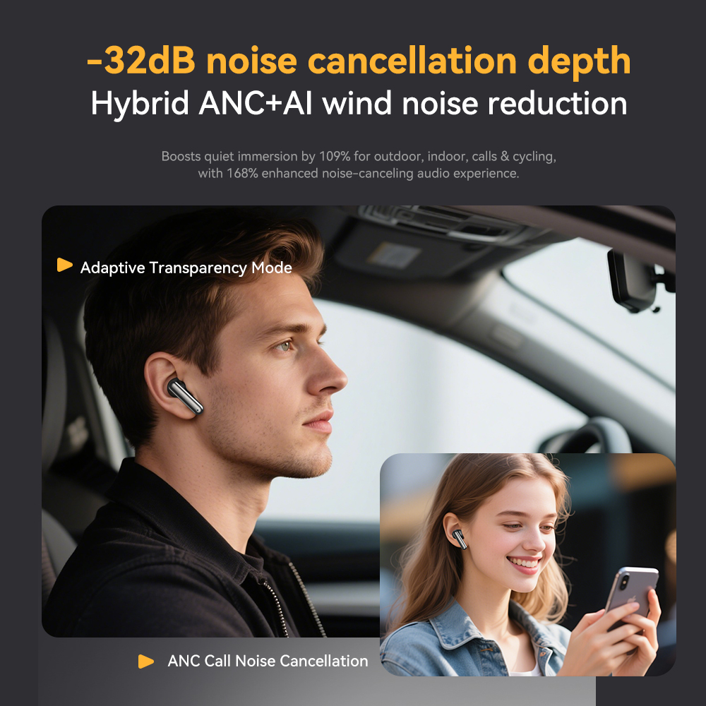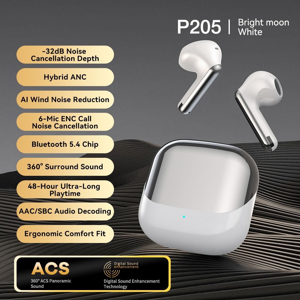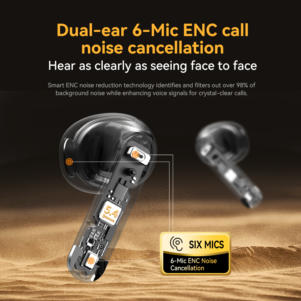 | Bluetooth Chip: JL7096D6, V5.4 Battery Capacity: Earbuds - 40 mAh, Charging Case - 400 mAh Playtime: 8-9 h (at 60% volume) ,Charging case endurance 32H Charging Time: Approximately 1.2h for earbuds and 2 h for the charging case Speaker Size: 13 mm Number of Microphones: 6 Silicon MIC (L+R) Other Functions: Call Noise Cancellation: 2 - MIC ENC Active Noise Cancellation: 2 - MIC ANC - FF + FB, hybrid dual - feed 28db max In - ear Detection: Optical Sensing Detection Waterproof Rating: IPX4 (LR) Charging Interface: Type C Hall Switch: Yes Processes: Electroplating, Painting, UV Coating; Colors: Dark gray, silver white, skin gold color | Product Certification:CE ROHS FCC |