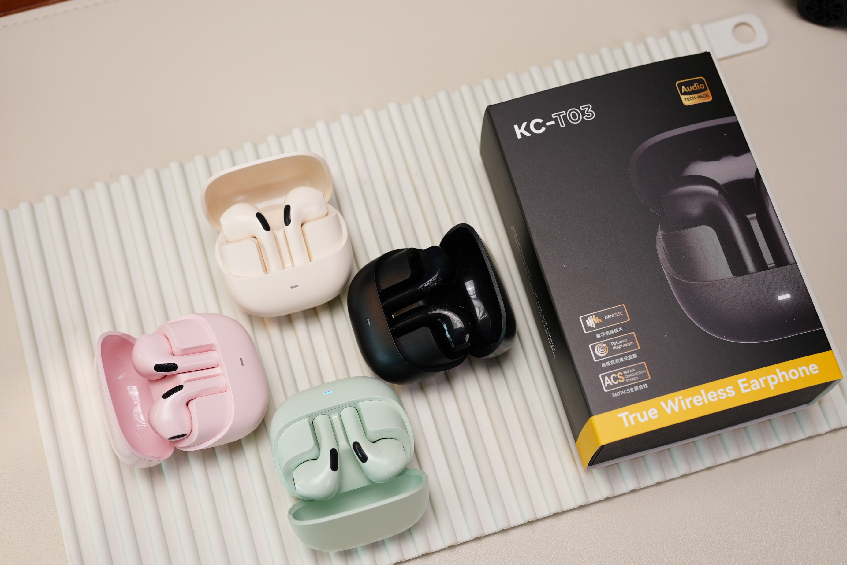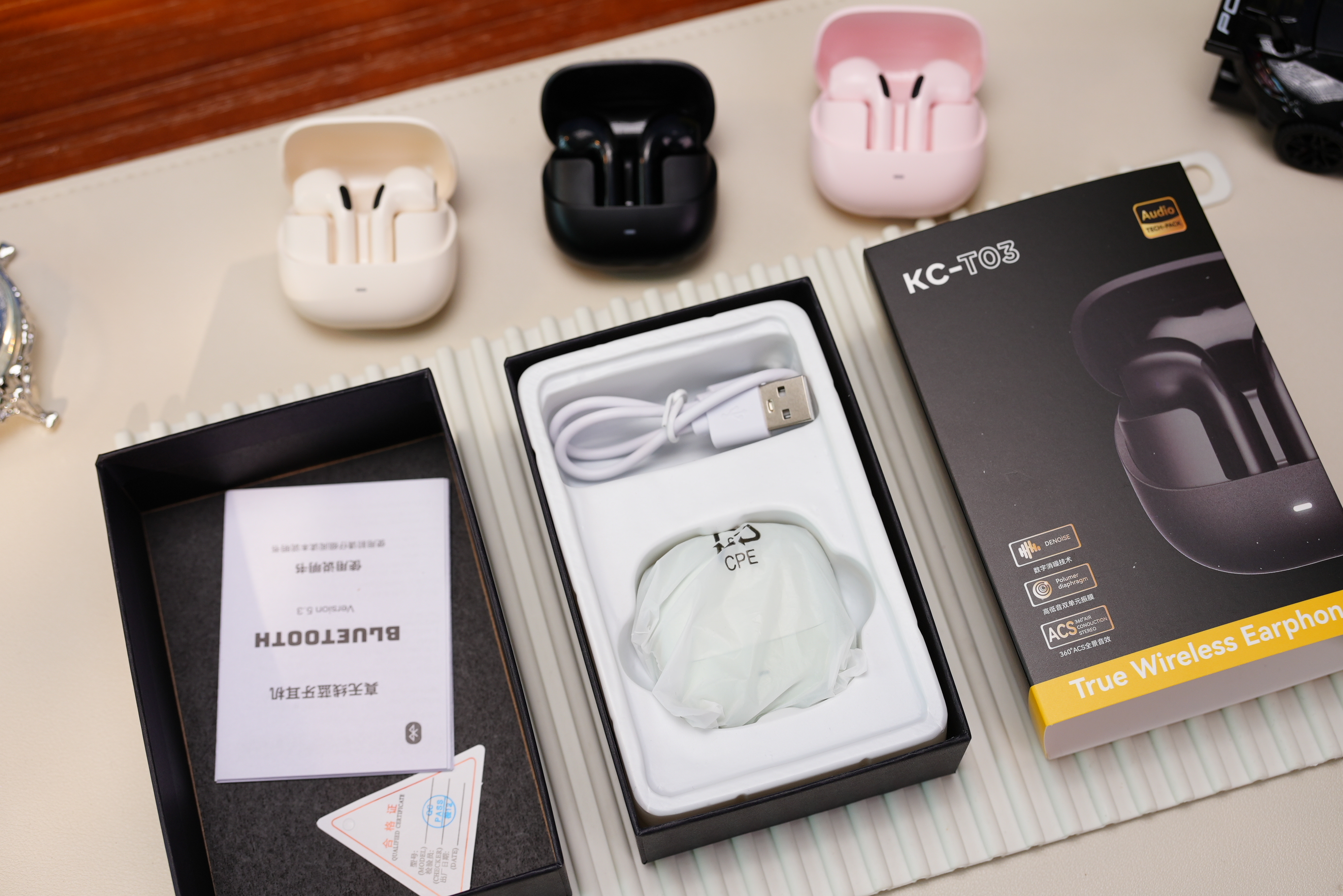 | Bluetooth chip: JL7023D, V5.4 Battery Capacity: Earbuds - 30mAh, Charging Case - 180mAh Playing time: 5 h (at 60% volume) Charging Time: Approximately 1h for earbuds and 2h for the charging case Speaker size: 13mm Number of Microphones: 2 MIC (LR) Waterproof Rating: IPX4 (LR) Charging interface: Type C Craftsmanship: The flip cover of the charging case is painted with metallic paint. Colors: Black, skin tone, green, pink | Product Certification:CE FCC MOQ500 |