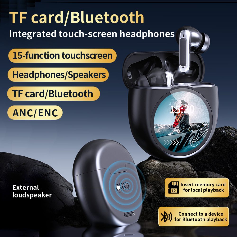 | Bluetooth Chip: JL7003D4 V5.4 Battery Capacity: Earbuds - 30 mAh, Charging Case - 450 mAh Playtime: 5h (at 60% volume) Charging Time: Approximately 1h for earbuds and 2h for the charging case Speaker Size: 13mm Number of Microphones: 4 Silicon MIC (LR) Other Functions: Screen functions, battery level display,EQ music TF card support. Download MP3s, Bluetooth local music mode via charging case. Touch Screen: 1.47-inch TFT Circular Call Noise Cancellation: 2 MIC ENC Active Noise Cancellation: ANC-FF Waterproof Rating: IPX4 (LR) Charging Interface: Type-C Hall Switch: Yes Processes: LR earphone faceplates, electroplated. Colors: Black, White | TF Memory Card Local Music Playback Mode, Bluetooth TWS Earphone Mode, Charging Case Speaker Audio Mode, Phone Mobile Device Bluetooth Speaker Audio Mode. Product Certification:CE ROHS,conform to:FCC |